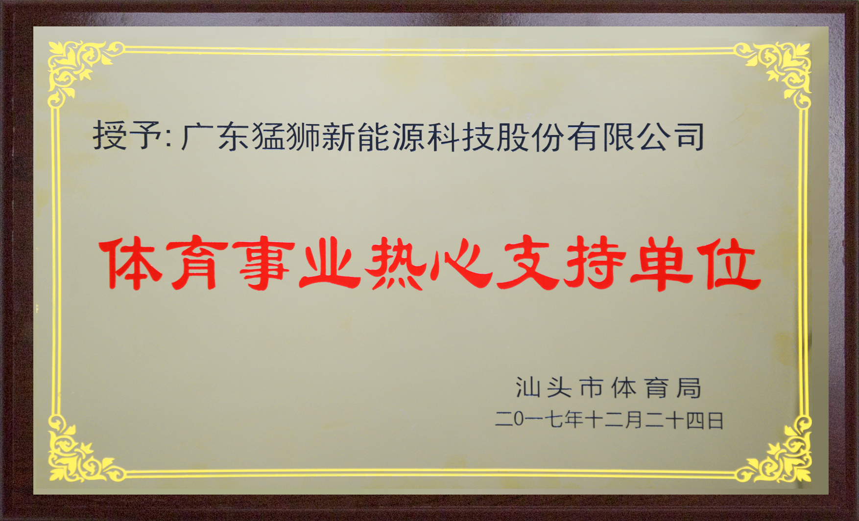 汕头市体育局授予猛狮科技“体育事业热心支持单位”荣誉称号