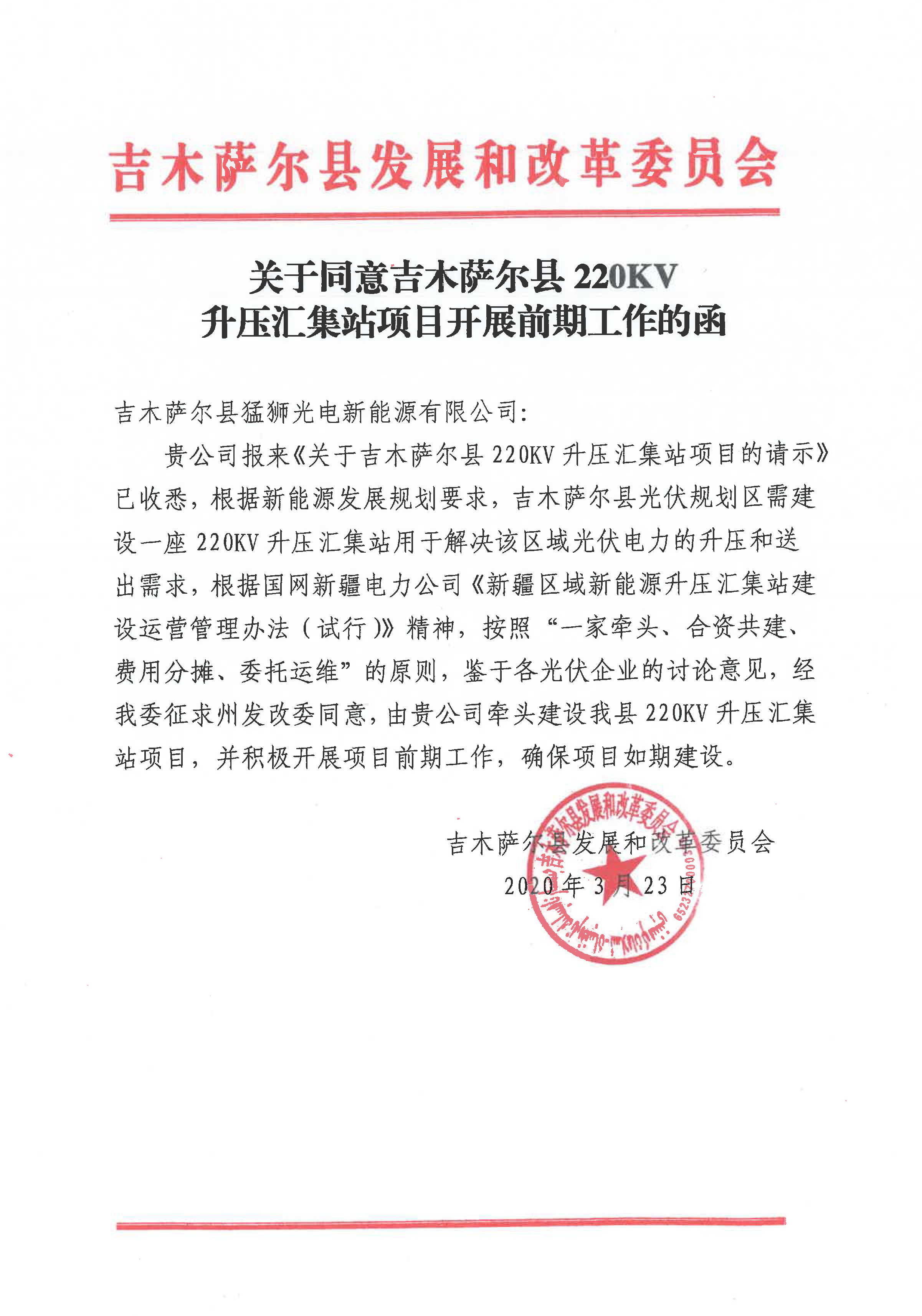 同日,吉木萨尔县人民政府就该项目专门致函国网昌吉供电公司,明确推荐吉木萨尔县猛狮光电公司牵头建设该县220KV升压汇集站项目。
