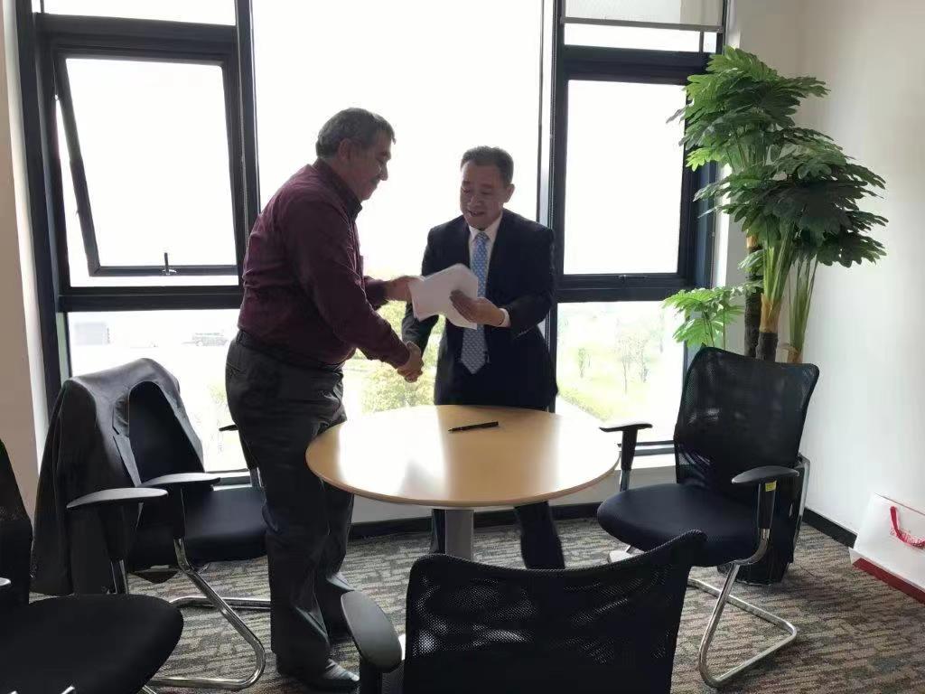猛狮科技陈乐伍董事长(左)、王少武总裁(右)授予林伯连同志“功勋员工”荣誉证书